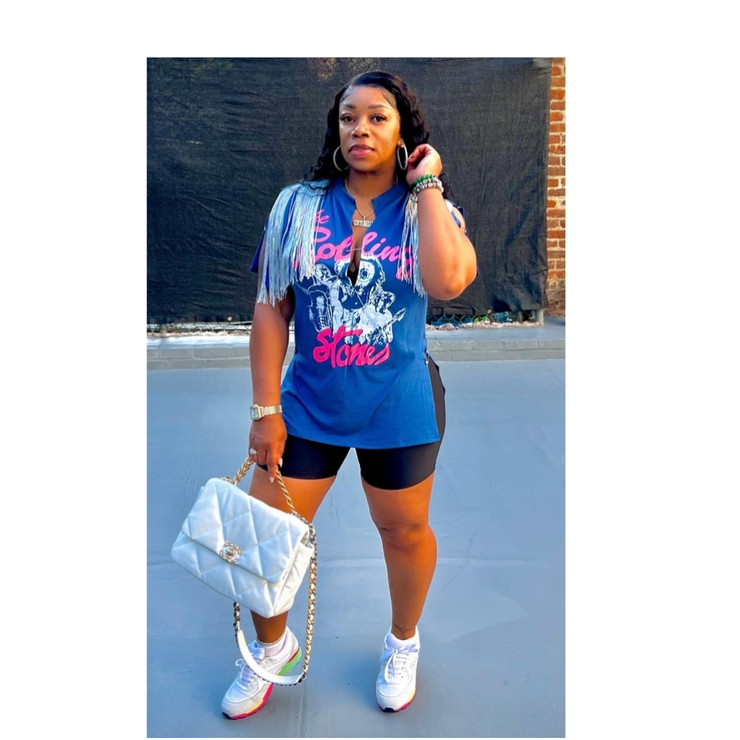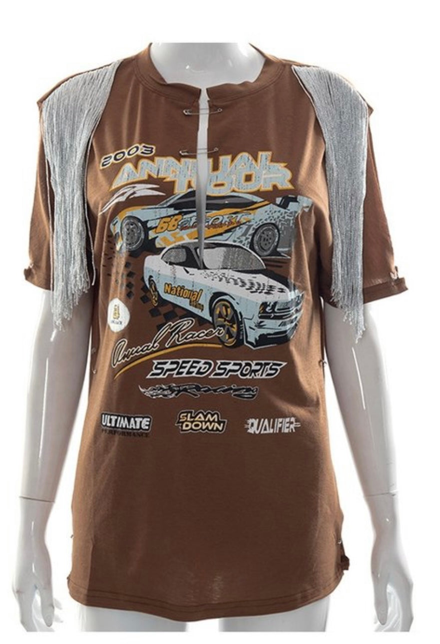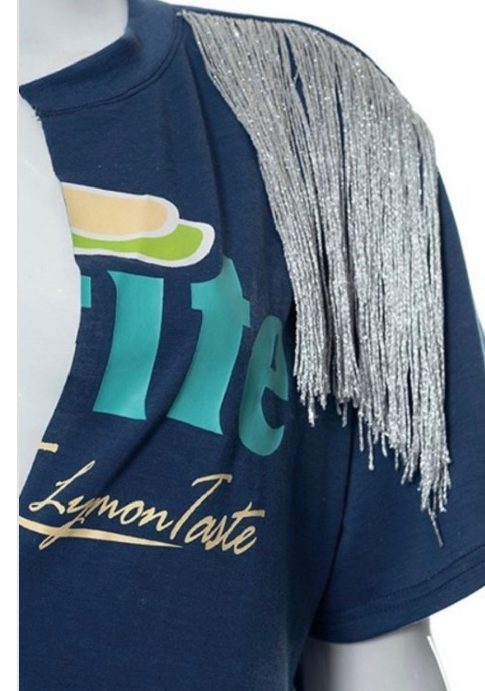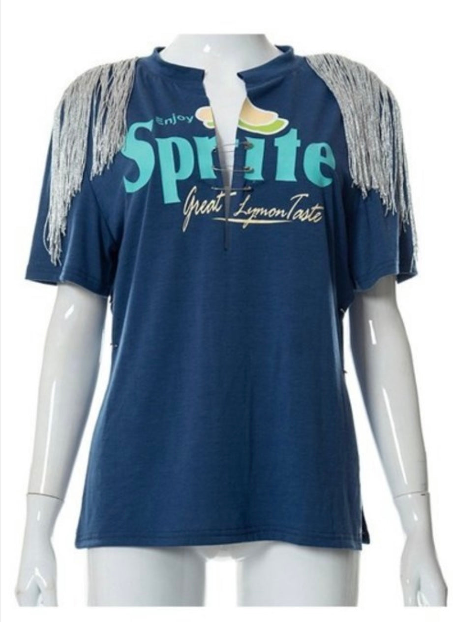 Short Sleeve V Neck Top with Tassel trimmed on shoulders