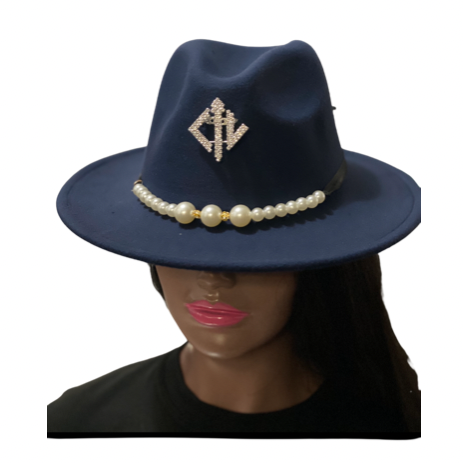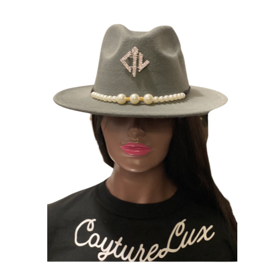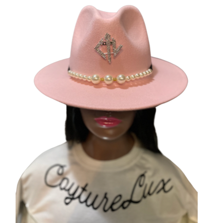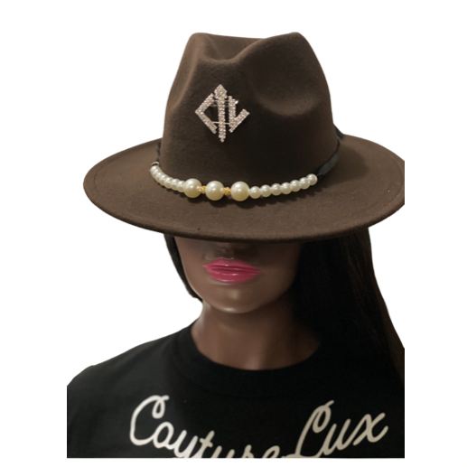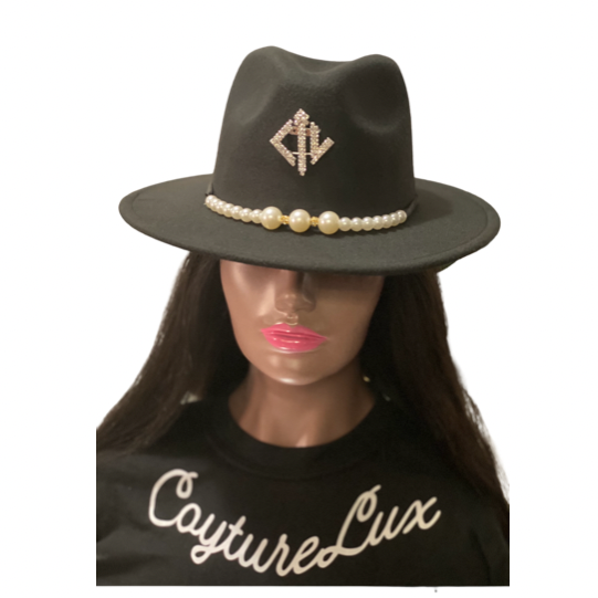 • CTL Brooch with Pearl and Black Ribbon Tied Around Brim of Fedora. Hats are Adjustable!