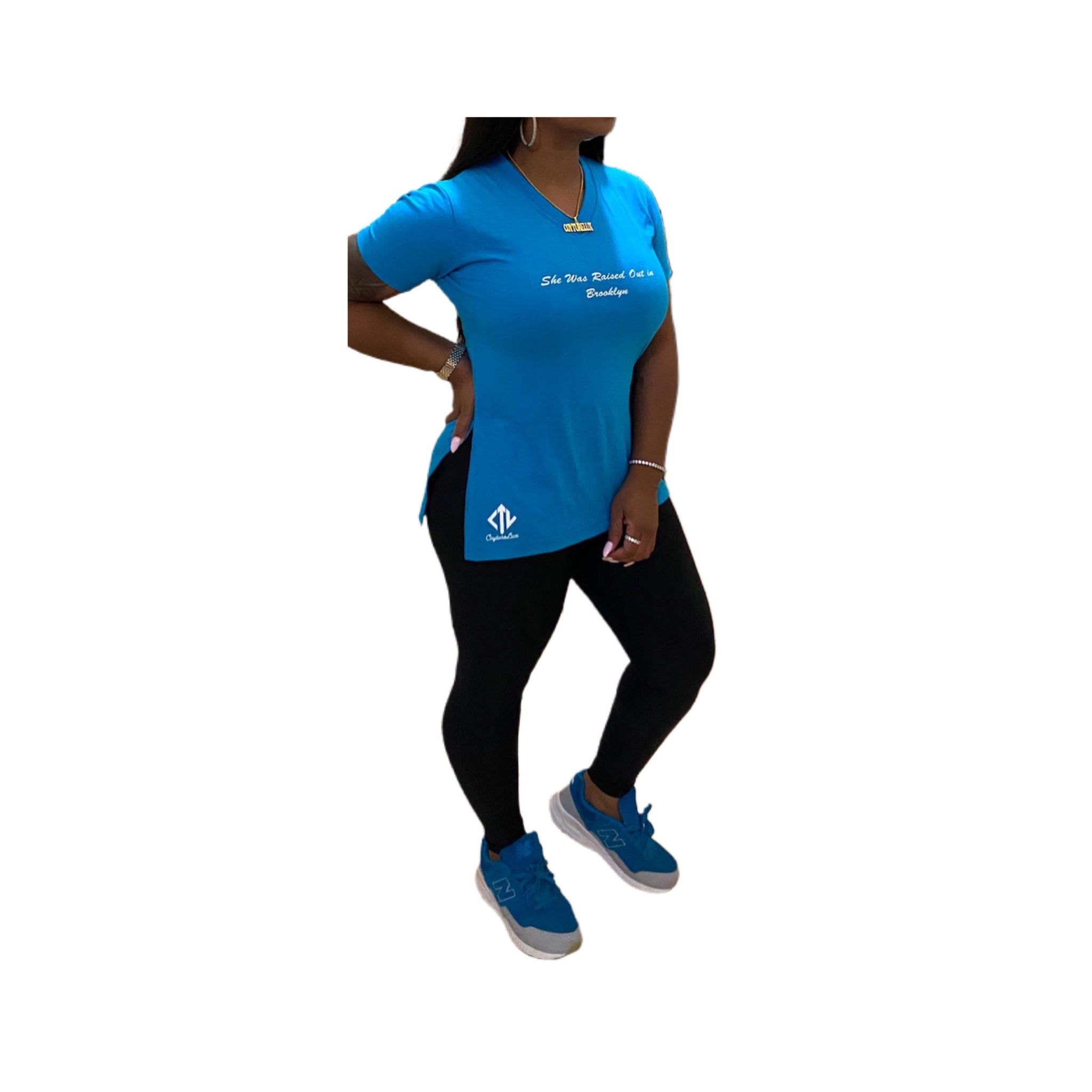 "RAISED OUT IN BROOKLYN" V-NECK TEE WITH SIDE SLITS ON EACH SIDE...